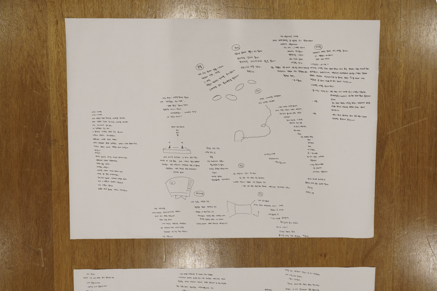 ‘나의 극장을 갖고 싶다’라는 막연한 꿈은 현실적인 문제 앞에서 ‘귀한 장면들을 쌓다 보면 우주 저기 어딘가에서 나의 극장을 지어지고 있을 것’이라는 믿음으로 전환한다. 어쩌면 극장은 물리적인 건축물로써 건재하는 것이 아닌 ‘같은 장면에 놓인 우리가 주고받은 공기 입자의 모임’이라고 다시 한번 믿어보면서. 겨울방학 동안 그 귀한 것들이 무엇인지 커다란 종이 위에 투박하고 거칠게 적어보았다.