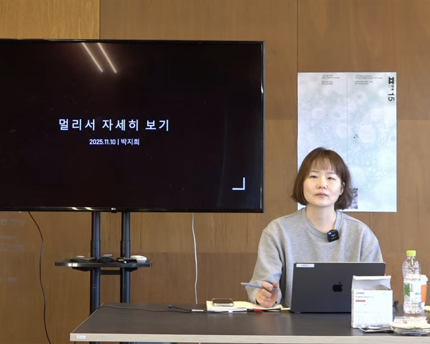 작가님이 곰팡이·방직기계·실험 도구·고대 생물이 남긴 흔적 등 서로 다른 시간대의 사물들을 어떻게 바라보고 재구성하는지 직접 들으며, 작업이란 결국 사물과 인간, 비인간이 얽힌 복잡한 관계 속에서 다시 경로를 그려가는 일이라는 생각이 들었습니다. 무엇보다 인상 깊었던 순간은 직접 키운 곰팡이에서 색을 추출하는 과정을 보여주신 부분이었는데요. 사라지고, 남고, 다시 태어나는 미세한 변화들을 눈으로 확인하며, 기록과 형태의 경계가 얼마나 유동적인지 느낄 수 있었습니다.