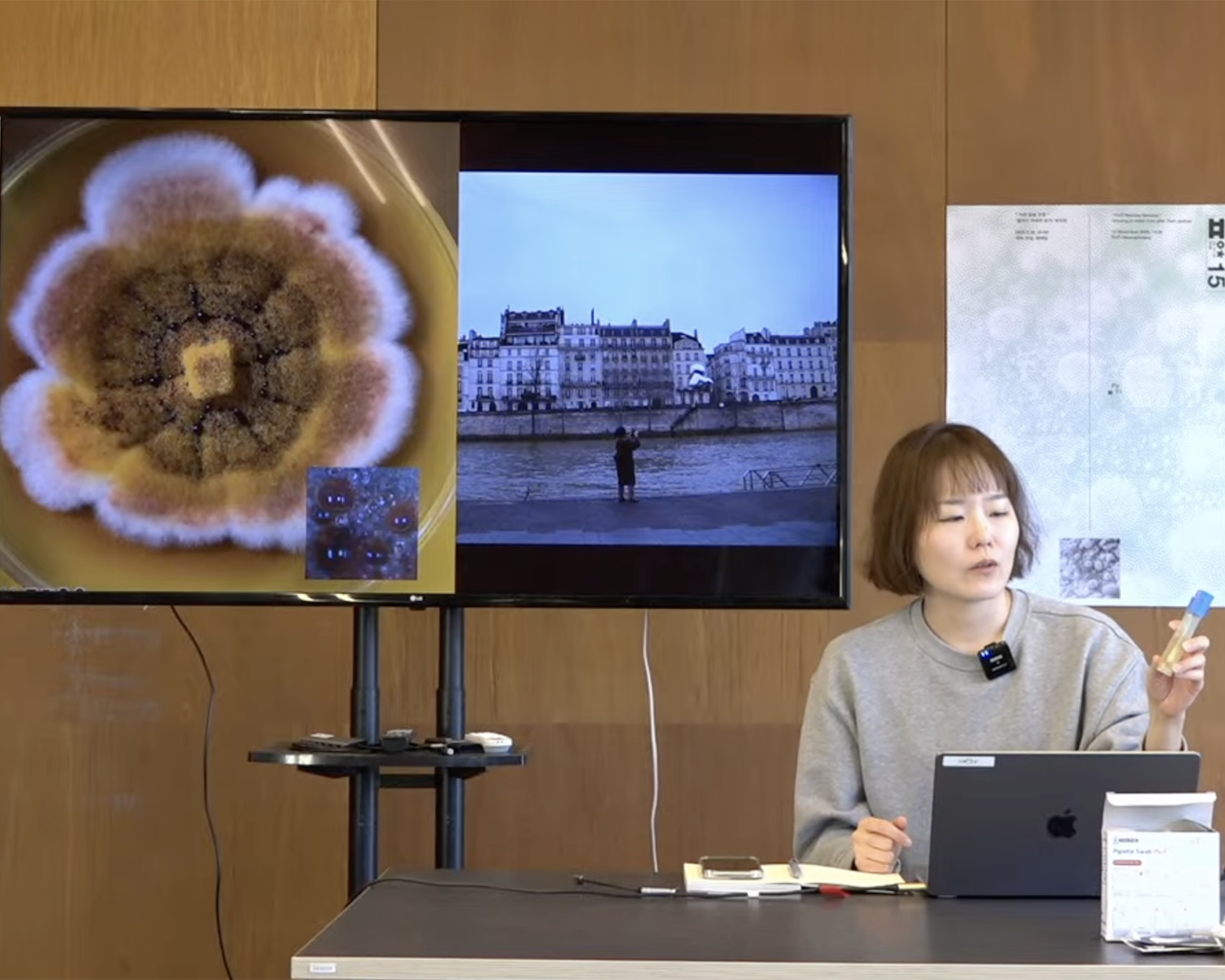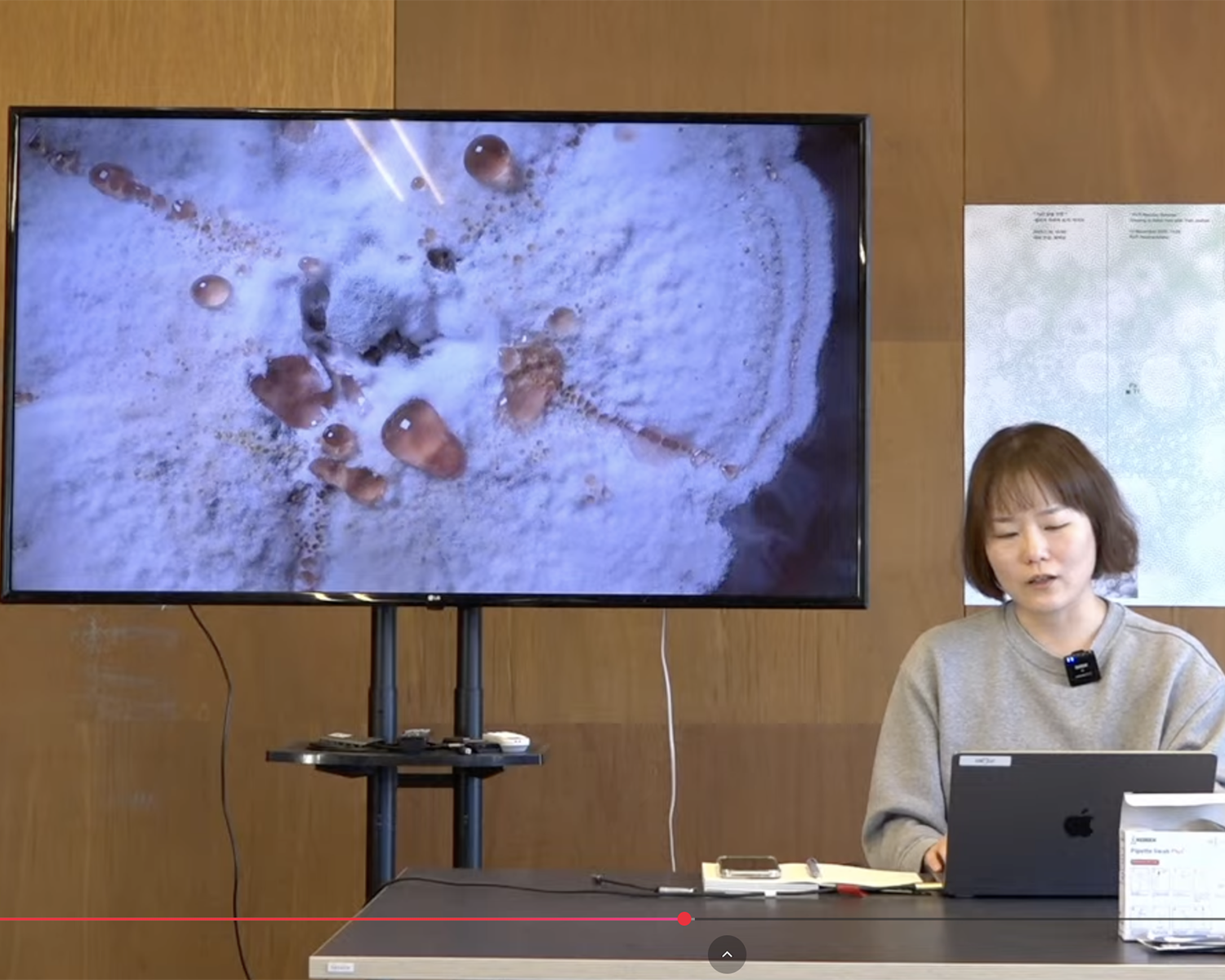 작가님이 곰팡이·방직기계·실험 도구·고대 생물이 남긴 흔적 등 서로 다른 시간대의 사물들을 어떻게 바라보고 재구성하는지 직접 들으며, 작업이란 결국 사물과 인간, 비인간이 얽힌 복잡한 관계 속에서 다시 경로를 그려가는 일이라는 생각이 들었습니다. 무엇보다 인상 깊었던 순간은 직접 키운 곰팡이에서 색을 추출하는 과정을 보여주신 부분이었는데요. 사라지고, 남고, 다시 태어나는 미세한 변화들을 눈으로 확인하며, 기록과 형태의 경계가 얼마나 유동적인지 느낄 수 있었습니다.
