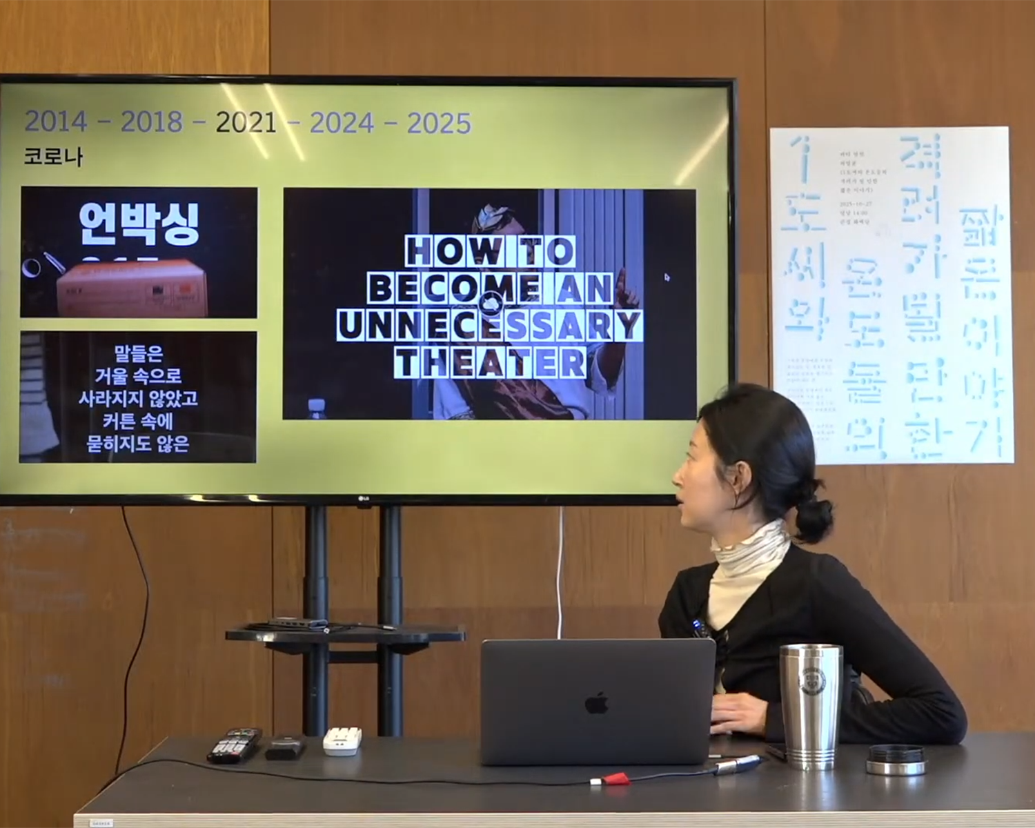 공연예술과 그 주위의 재미있는 일, 필요한 일, 없었던 일들을 생각하고 만들어 내는 것, 공연의 행위와 과정이 사람에게 좋은 영향을 미친다는 생각을 전제로 ‘인간술로서의 공연예술 수업‘을 기획하고 운영하는 일, 공연 아닌 것을 공연으로 보거나, 공연인 것을 공연 아닌 것으로 해석하는 법을, 공부하고 추적하고 있습니다. 그 시간을 돌아보며 이야기 나누는 것이 격려가 될 수 있었으면 하는 마음으로 여러분을 만나고 싶습니다.”